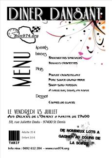L'association Run974.org "BOUGE". En effet, après ses journées roulages, les sorties non-officielles et officielles et ses diverses rassemblements, Run974 vient à nouveau vers vous pour vous proposez son "Premier Diner Dansant" qui se déroulera le Vendredi 13 Juillet 2012 au restaurant "Aux délices de l'orient" à Saint Denis.