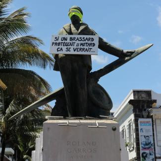 Il faut dire que la loi prévoit une amende 68 euros et un retrait de 2 points sur le permis de conduire de tous les récalcitrants. Les membres de la FFMC 974 (Fédération Française des Motards en Colère) ont donc décidé de mener une opération coup de poing : bander les yeux de la statue de Rolland Garros avec un brassard réfléchissant. Leur geste est symbolique : la FFMC explique qu'un brassard ne sert à rien sur une statue, pourquoi serait-il plus utile sur un motard ?